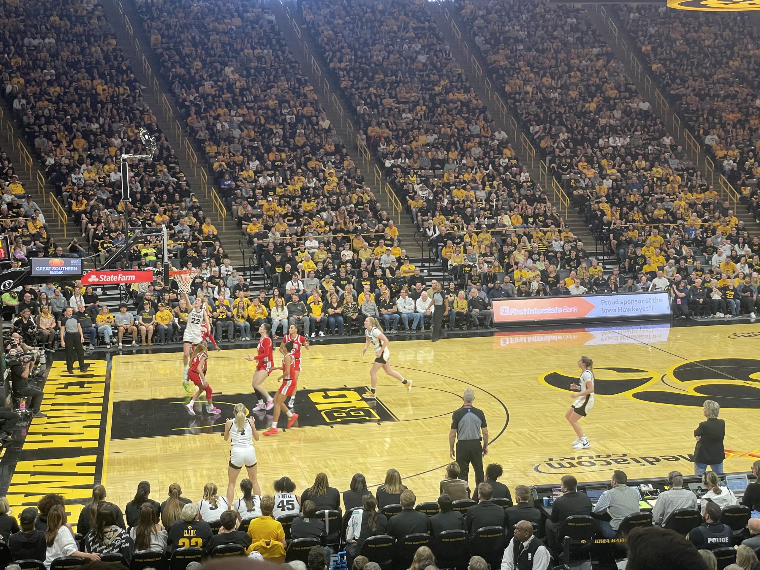 The crowd came into the door expecting to see Caitlin Clark set the all-time NCAA scoring record. She sat just 17 points behind for LSU Tiger Pete Maravich. What they saw, in the first quarter, was just about everyone but Clark get into the scoring action. Stuelke had 10 points in the first 10 minutes. Gabby Marshall nailed a couple threes and Sydney Affolter, Kylie Fuerbach, and Addison O’Grady each had a deuce, as Iowa led 28-19 after the first frame. In the middle of the second the crowd chanted Mollie Davis’ name. Unfortunately, it was because she was being carried off the court after an apparent leg injury. Davis got a rebound off of a teammate’s miss, but her leg appeared to buckle as she landed on the court. Coach Bluder noted that the team rallied after the injury. “That was a really tough thing to overcome. And I’m proud of Kate, Kylie, and Sydney for how well they handled that”, said the head Hawkeye. A chant of Mol-lie filled the arena as trainers carried Davis to the tunnel. Ohio State made a run and brought the score back within four, but Iowa was able to cap the first half with a 6-0 run in the final 0.3 seconds. It started when Hannah Stuelke received a deep pass from Clark with five seconds remaining. She was fouled just before the clock hit triple zeros, and the play continued when OSU’s Cotie McMahon was tagged with a technical foul. Stuelke hit her two free throws, and then Caitlin Clark stepped to the line for the technical free throws. The WNBA bound senior gave the fans another reason to cheer. As she dropped both free throws through the net she tied, then broke Maravich’s scoring record. But the loudest cheer of the end of the half secquence was when Stuelke nailed a catch and shoot layup at the buzzer. The bucket didn’t count, but the crowd went bananas to send the team to halftime with a 48-39 lead.