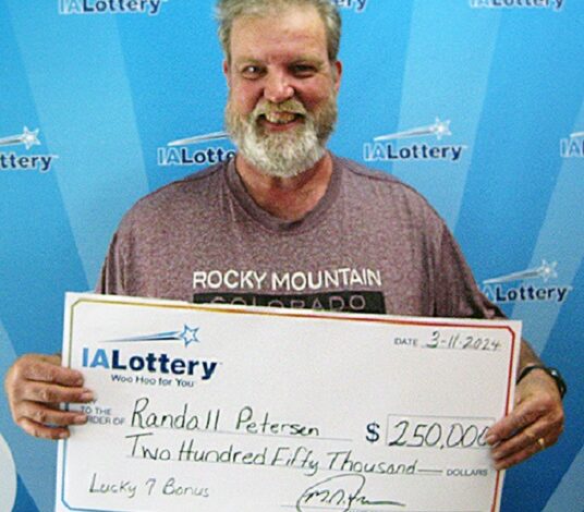 Randall Petersen of Mason City scored the seventh top prize of $250,000 in the “Lucky 7 Bonus” scratch game. He purchased his winning ticket at an Express Lane in Davenport and claimed his prize Monday at the lottery’s Mason City regional office.