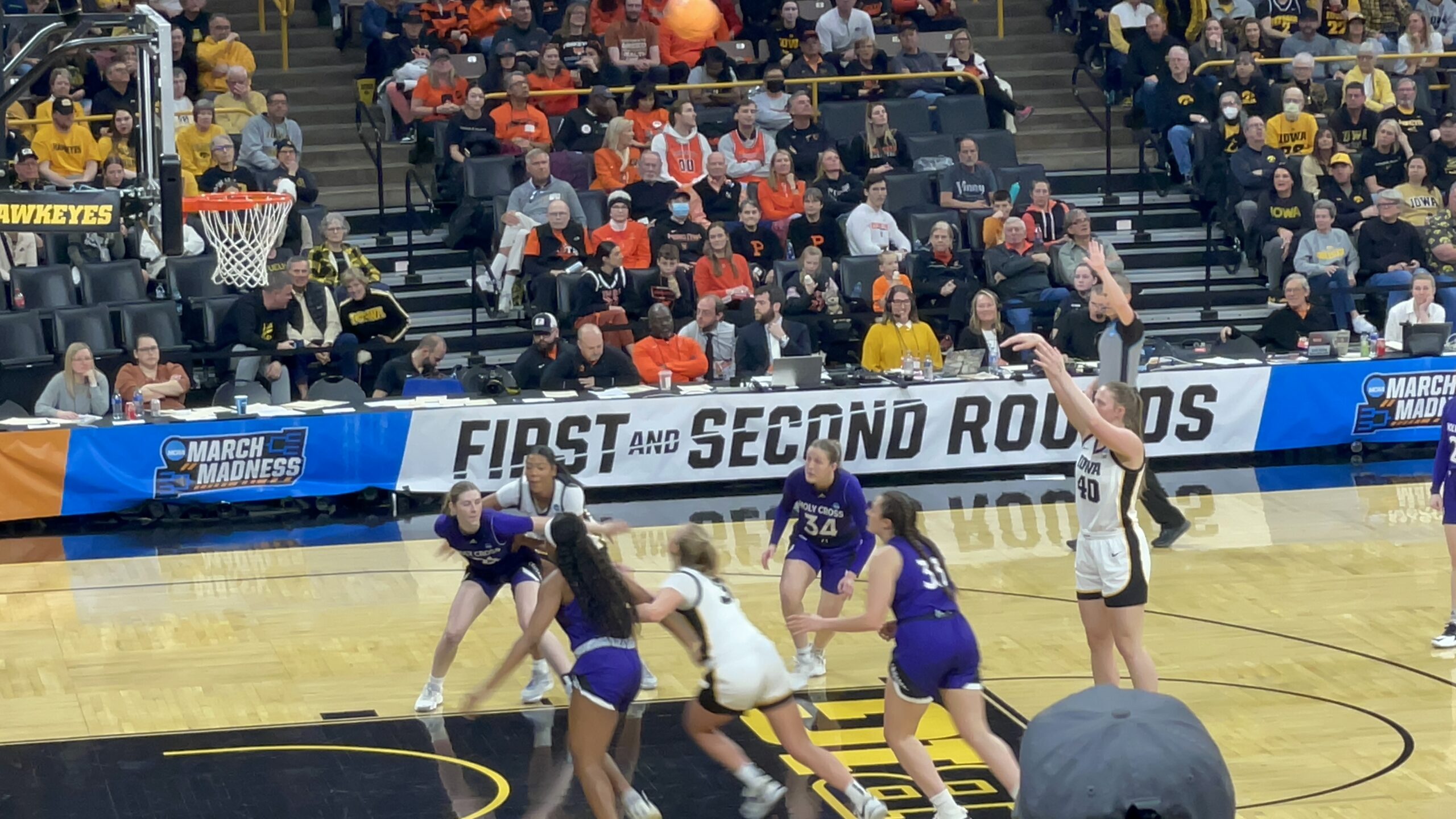 Early in the second quarter we saw the physicality play through as Power-Cassidy leveled Caitlin Clark with an elbow across the bridge of the nose. After review, an intentional foul was called. Clark hit both free throws and Iowa led 28-21. After that Kate Martin hit the deck as she fell trying while traversing the lane and hit her head on the floor. Martin left game at the 7:45 mark. What ensured was some of the most intense basketball and crowd action of the game. Players shot threes, Marshall made one. Players rebounded hard. Clark collected one. A three by Clark was waved off by a foul called on Holy Cross. The crowd roared and the intensity of the game ramped up far beyond what a 1-16 seed matchup would expect. Kate Martin returned at the 5:48 mark. For those that are keeping score, a 7-0 Iowa run in 1:11 commenced as soon as the girl they call “The Glue†reentered for the Hawks. The Glue continued to stick as Iowa extended a 28-21 lead to 45-27 with two minutes remaining in the half. The 18 point lead held to halftime as the Hawkeyes took a 48-30 lead to the break.